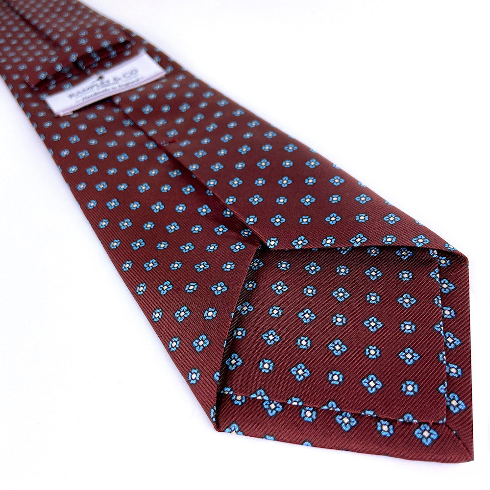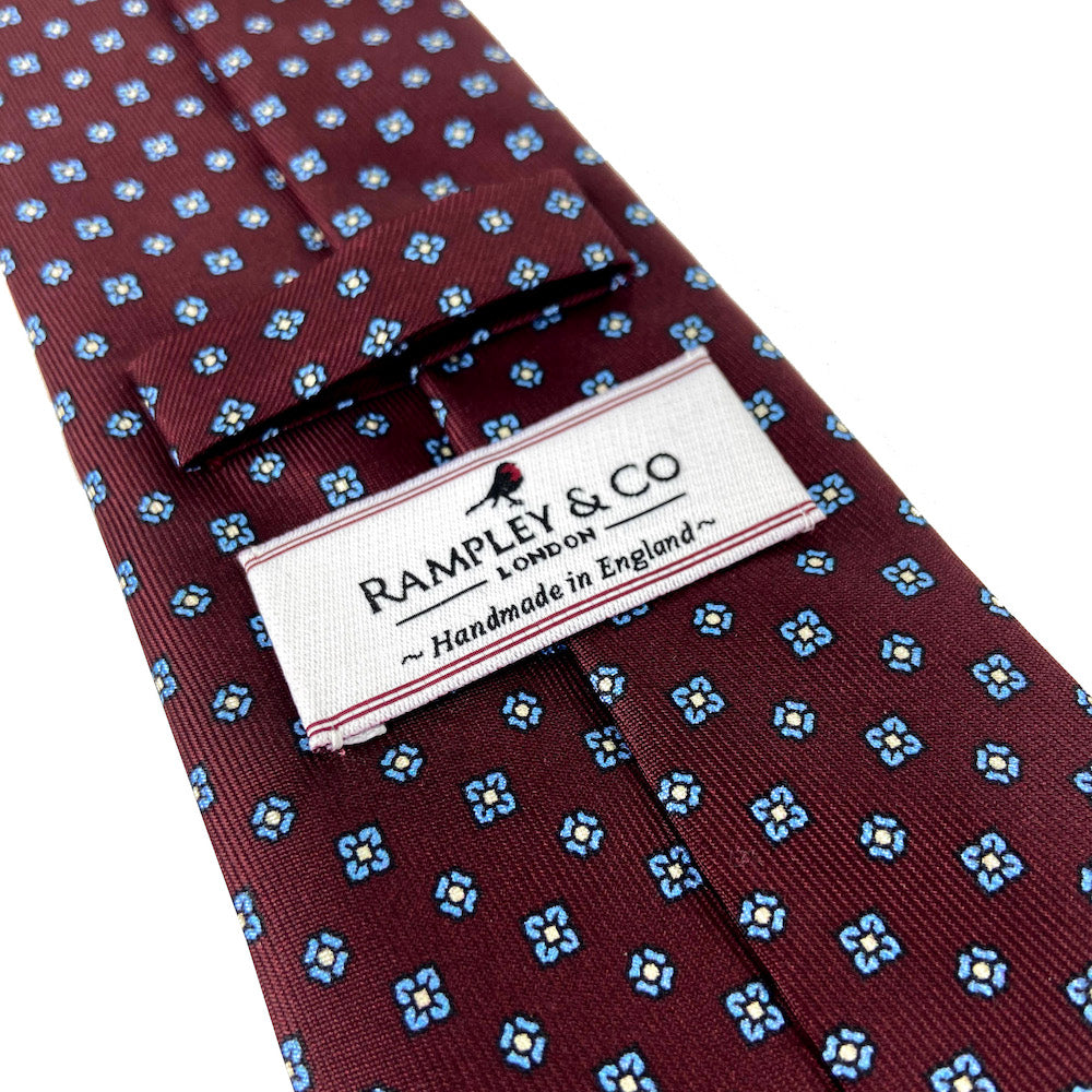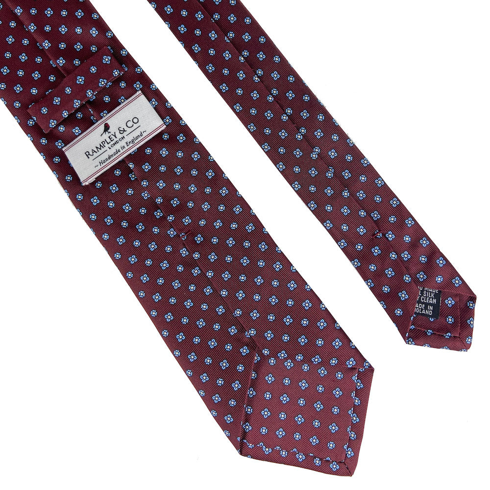 This Burgundy Floral Repeat Silk Tie is handmade in England and made from the finest quality silk. It provides a subtle addition to an outfit and can be used in both casual and formal occasions as well as matching with a variety of more exciting and colourful pocket square designs.