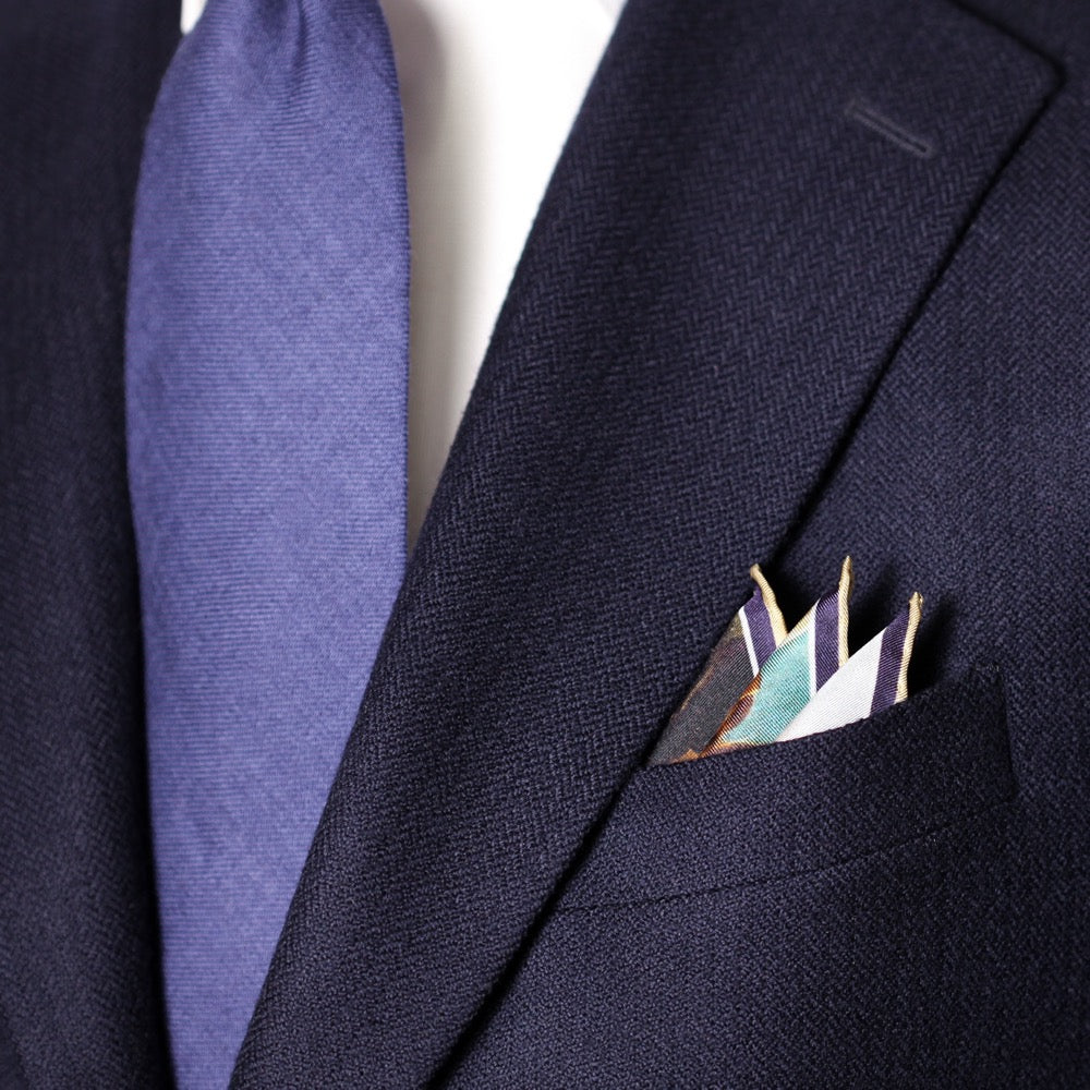 We believe that 40cm is the minimum size for a high-quality silk pocket square. Any smaller and it will slide down inside your pocket with any movement of your jacket, as well as limit the number of folds you can achieve. It goes without saying we would never advocate any form of pocket square holder. All our pocket squares are either 42cm x 42cm or 40cm x 40cm, unless they are linen or wool based in which case, a 33cm x 33cm square works perfectly with the more structural fabrics.