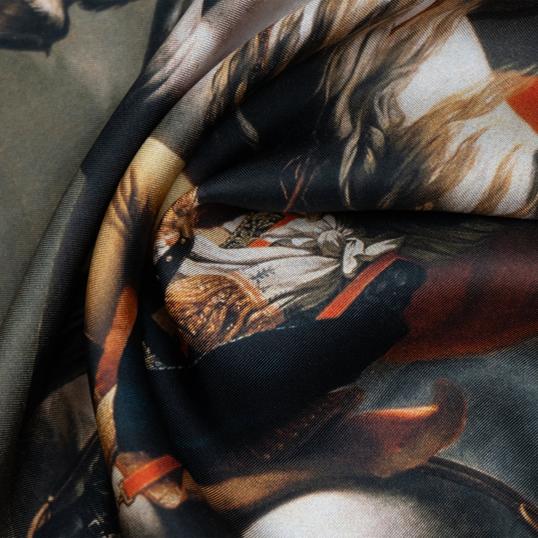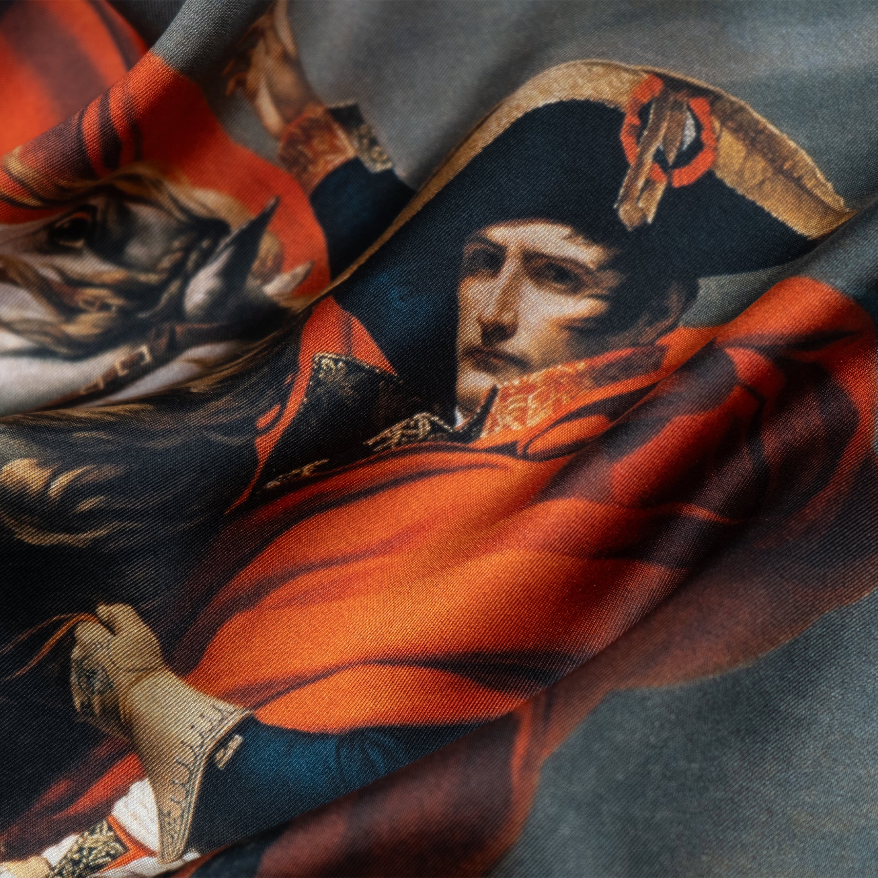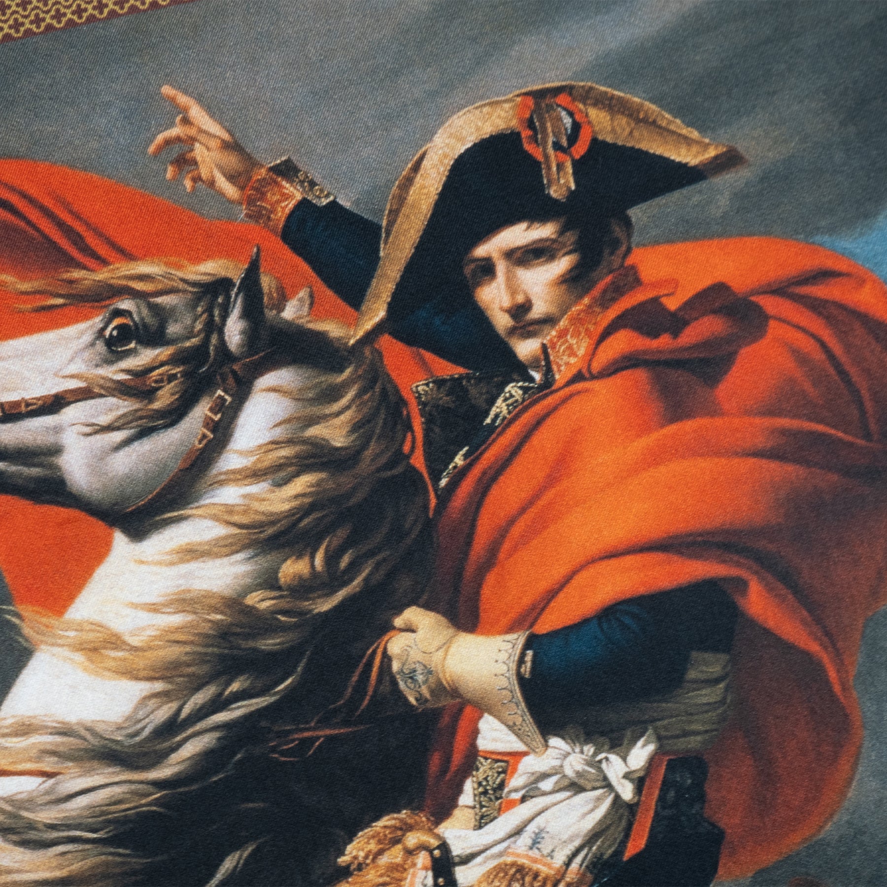 Here, Napoleon is depicted as the embodiment of command and composure, his cloak billowing dramatically as his horse rears against the rugged Alpine backdrop. David’s signature Neoclassical style is evident in the precise rendering of every detail—from the luminous textures of Napoleon’s uniform to the engraved names of historical conquerors on the rocks—underscoring themes of heroism, ambition, and destiny.