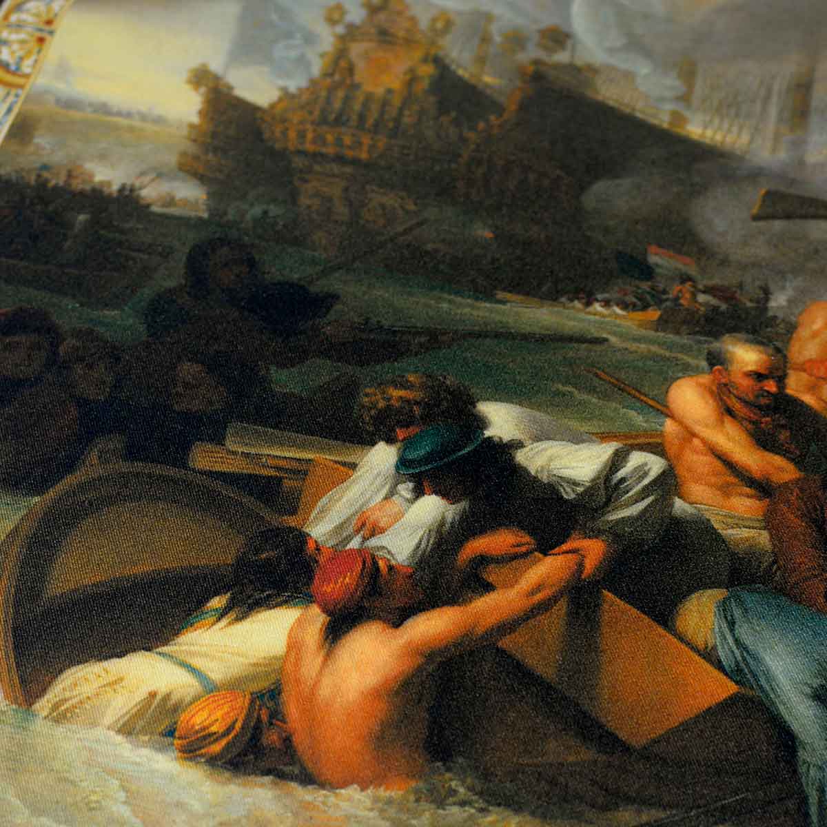 The painting’s colours are muted yet dramatic – we see the various uniform colours of reds and blues, the dramatic darker colours of the burning ships behind and the ominous grey-blue of the sea. West has depicted the distress on the faces of drowning soldiers, evoking the intensity of the moment. The scene is chaotic, as war often is, and the varied imagery blends together beautifully in a medley of conflict and desperation. The intricate border design will enable striking point folds.