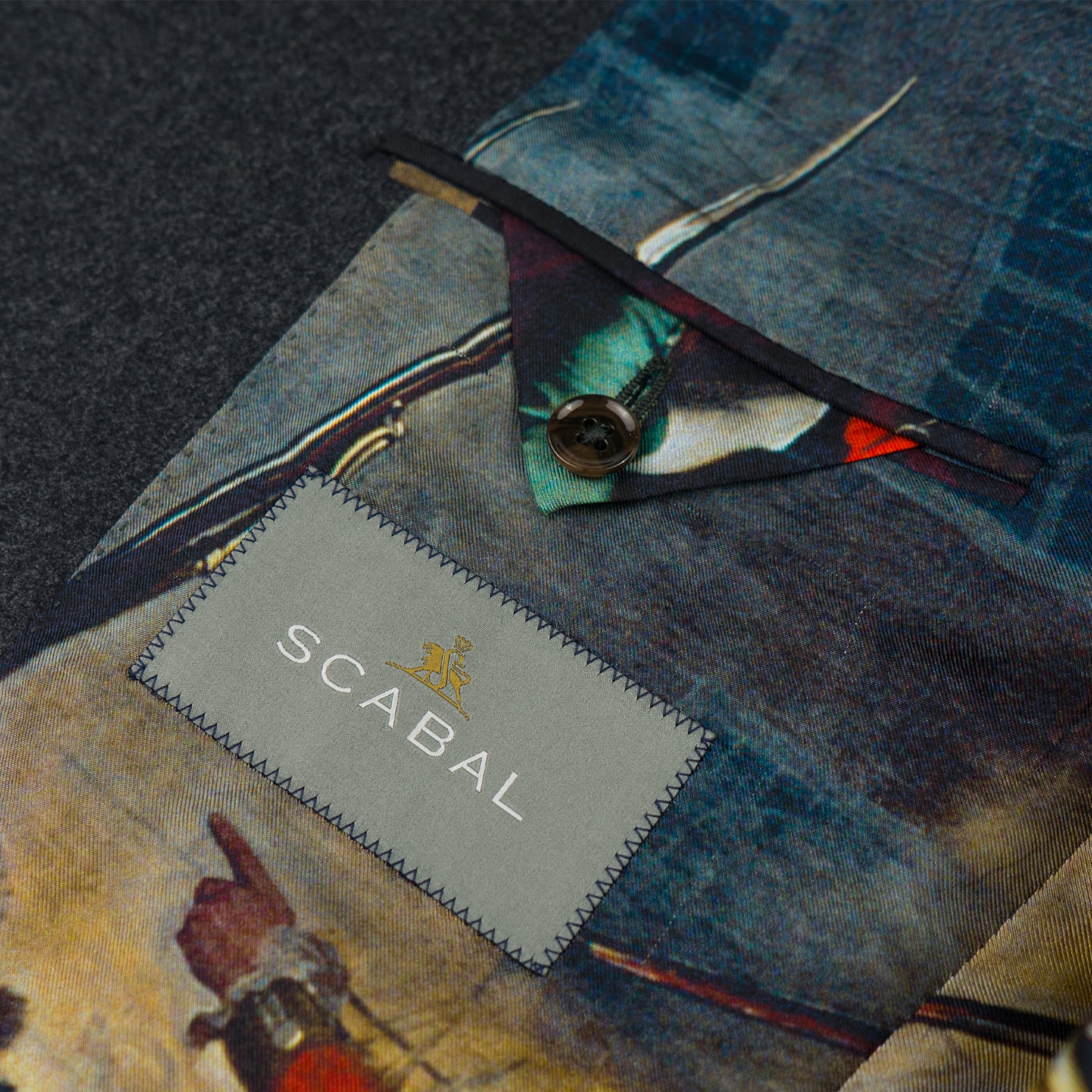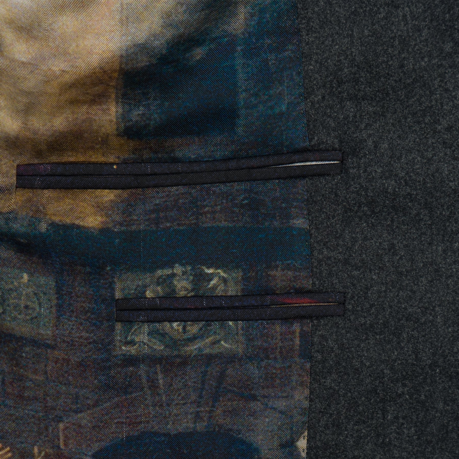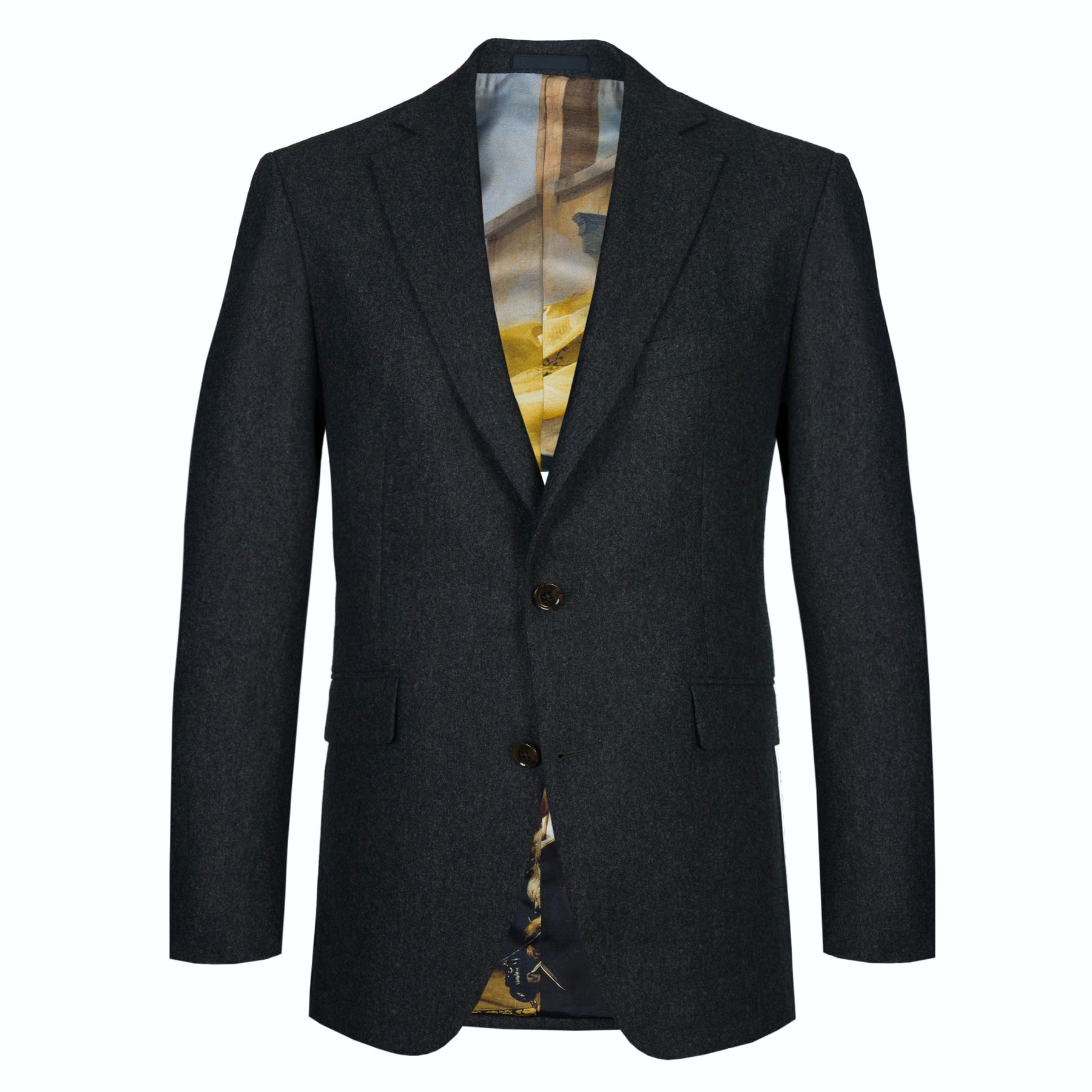 Crafted from 100% wool, our Dark Grey Wool Flannel Jacket epitomises understated British sophistication. The rich flannel cloth offers a soft, brushed finish with a beautifully smooth drape, providing both warmth and comfort through the cooler months. Its deep grey tone ensures exceptional versatility, equally suited to formal occasions or refined casual wear. The example shown features our Copley 'The Death of Major Peirson' silk jacket lining, but we offer you your choice of fine art lining to ensure you have something truly unique to add to your wardrobe.