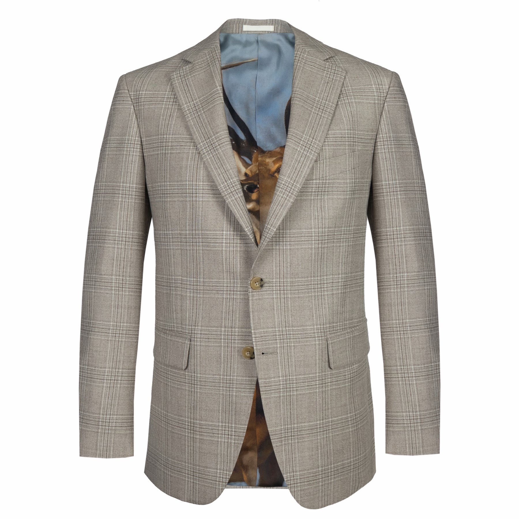 Crafted from 100% pure wool, our Mole Grey Wool Check Jacket embodies timeless British elegance. The subtle check pattern in soft brown and grey tones offers a refined update to a classic design, providing exceptional versatility for both formal and relaxed occasions. The example shown features our Landseer 'The Monarch of the Glen' silk jacket lining, but we offer you your choice of fine art lining to ensure you have something truly unique to add to your wardrobe.