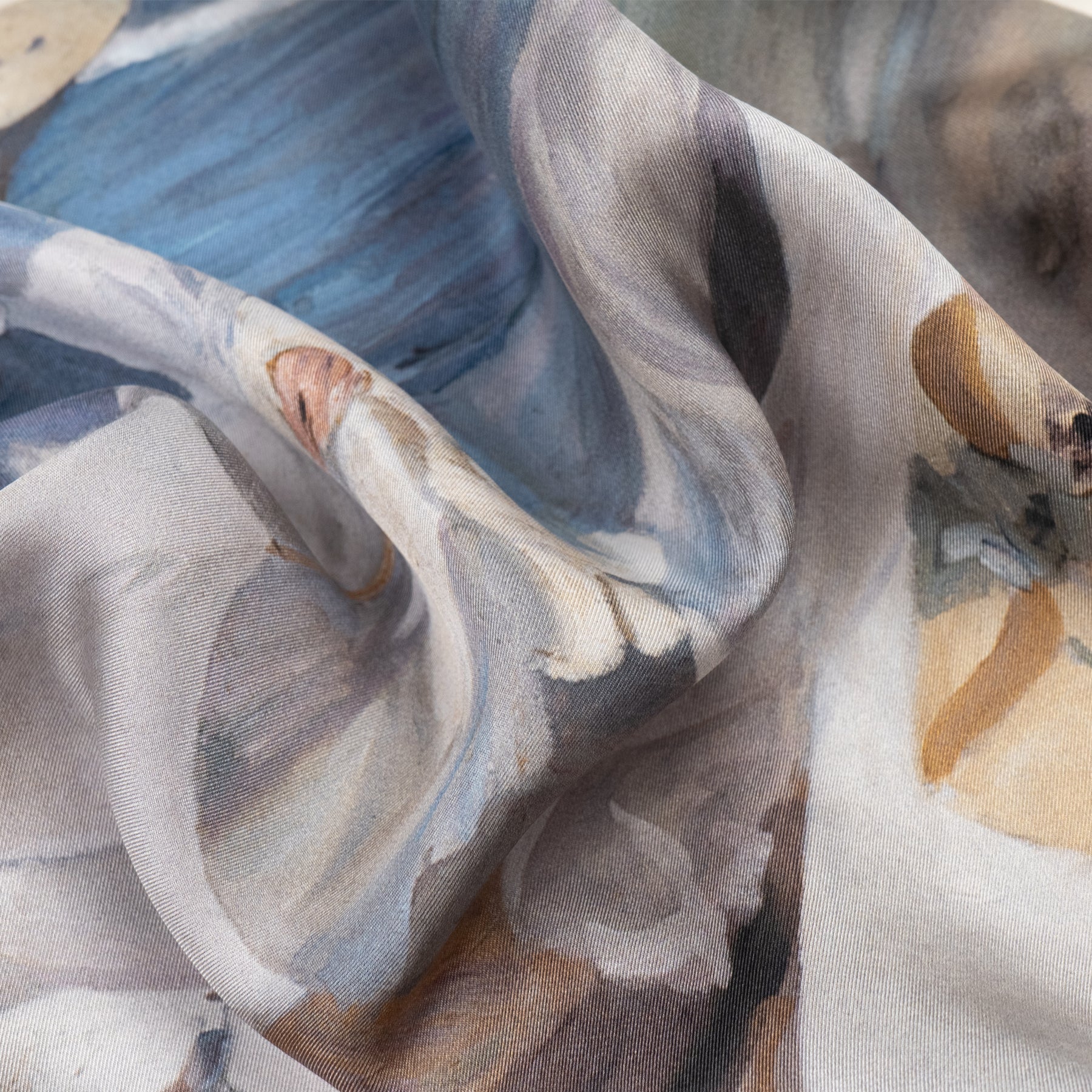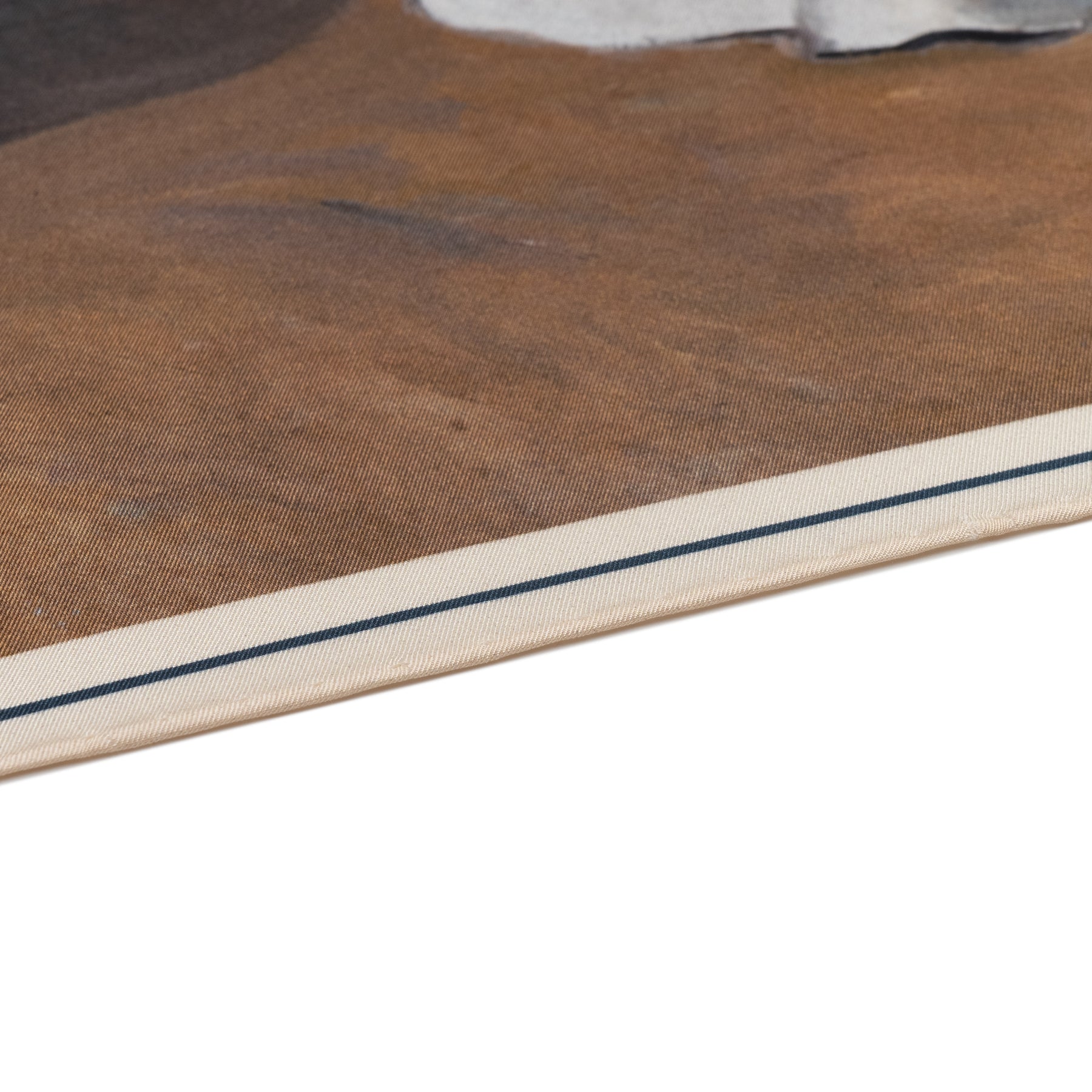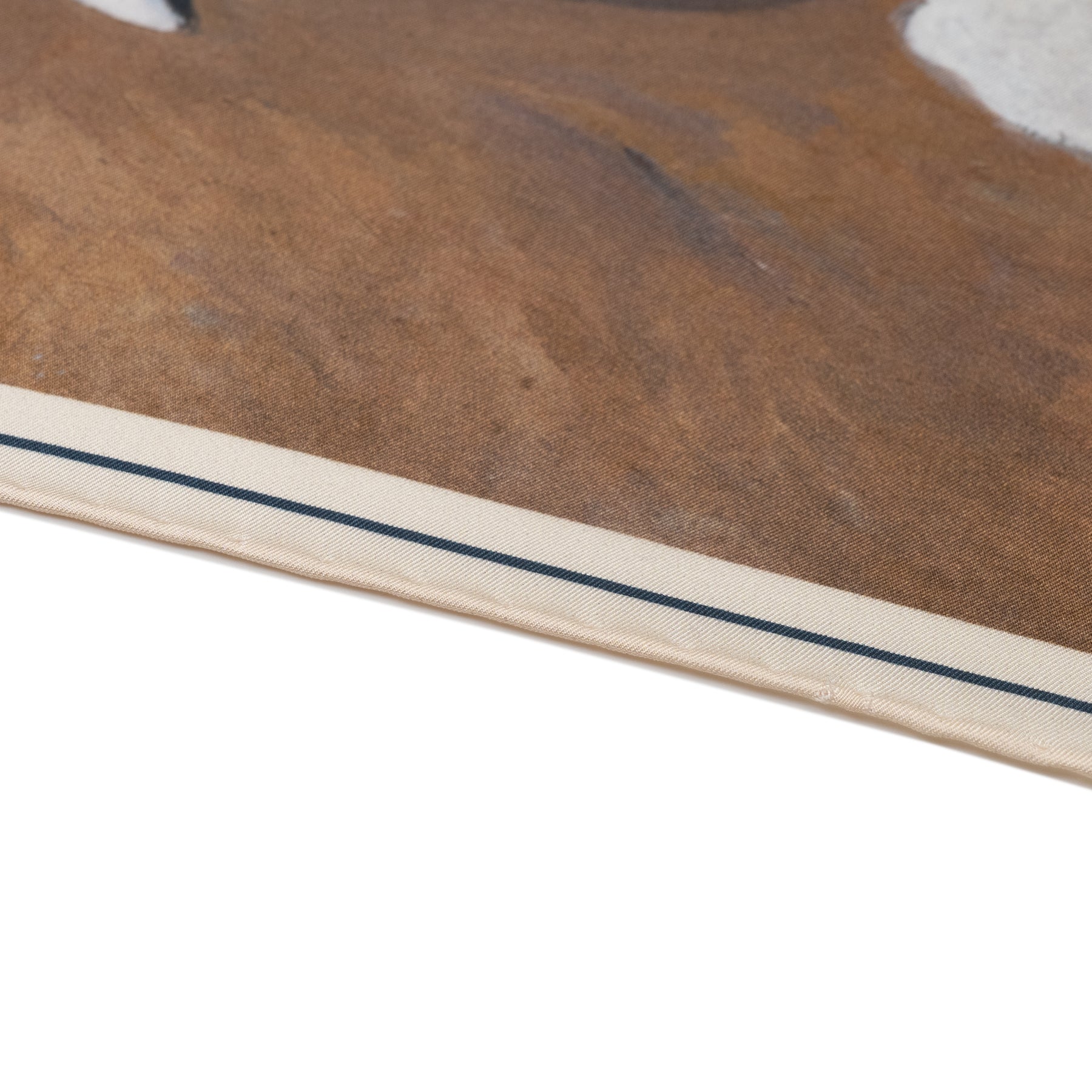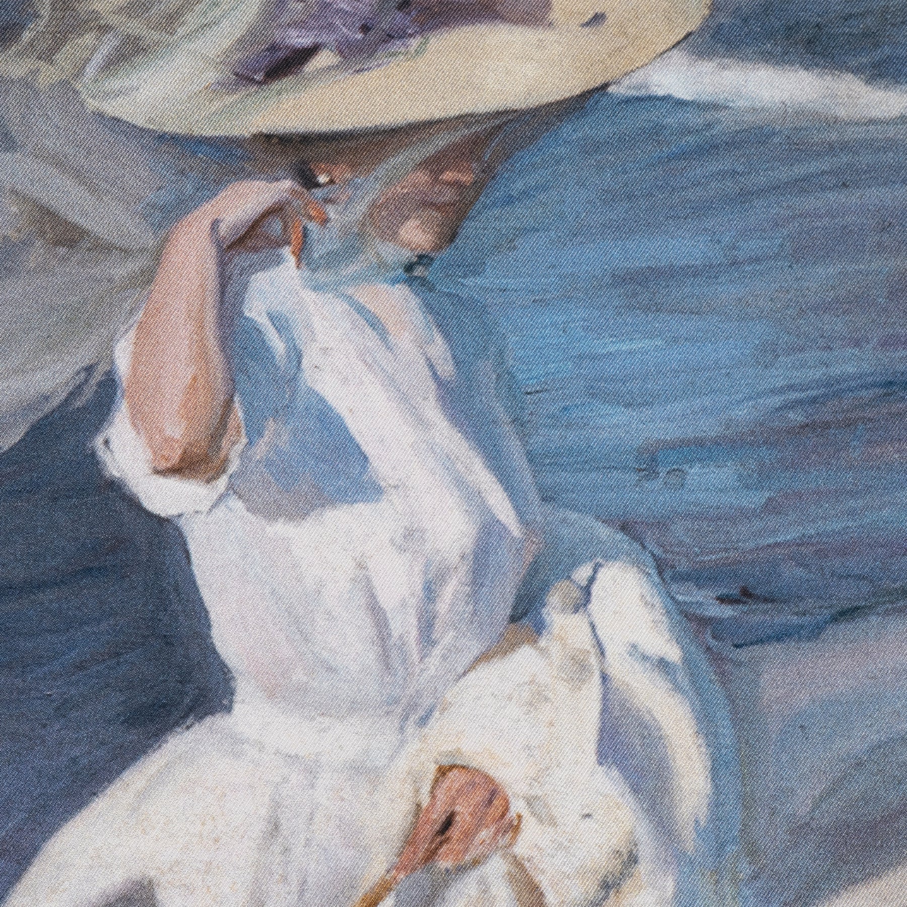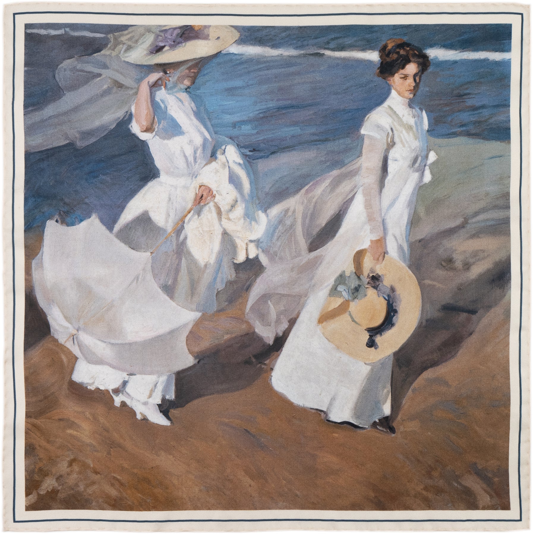 Rather than emphasising a distant horizon, Sorolla focuses on the figures and the sparkling shoreline, creating a composition that feels intimate, lively and effortlessly elegant. This design captures a fleeting moment of seaside leisure and familial connection, making it a versatile accessory for a navy blazer or a sandy‑toned linen jacket. Every fold conjures the gentle wind, the rhythm of the waves and the radiant warmth of a timeless Spanish afternoon.